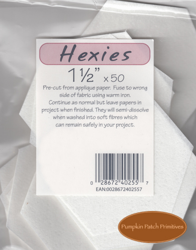 These precut hexies are the easiest method available for English Paper Pieced Hexagons. Fuse to wrong side of fabric, cut out roughly. Glue or tack edges over. Sew hexies together by hand or machine and use as desired. Leave paper as a stabilizer or wash to soften and partially dissolve.